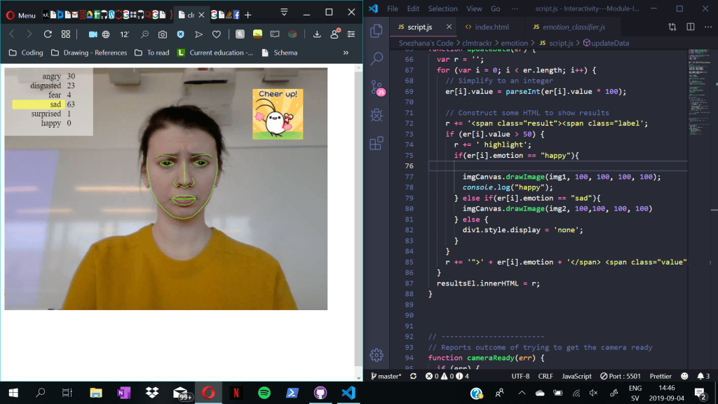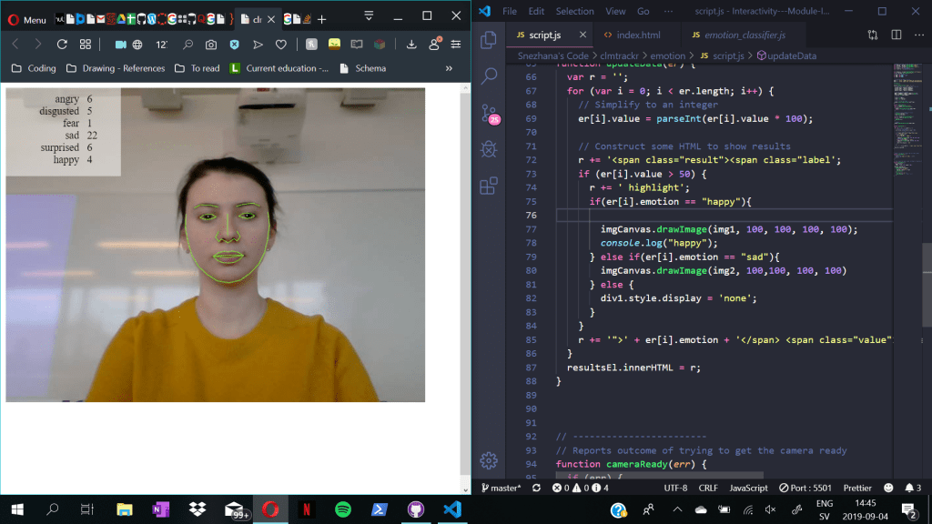 Reading through the already done code, and figuring out what was the goal of the project felt like very difficult and frustrating since we did not have much time left to create a good sketch. We also asked other students, if someone had better understanding of the topic, but that did not show much result.
